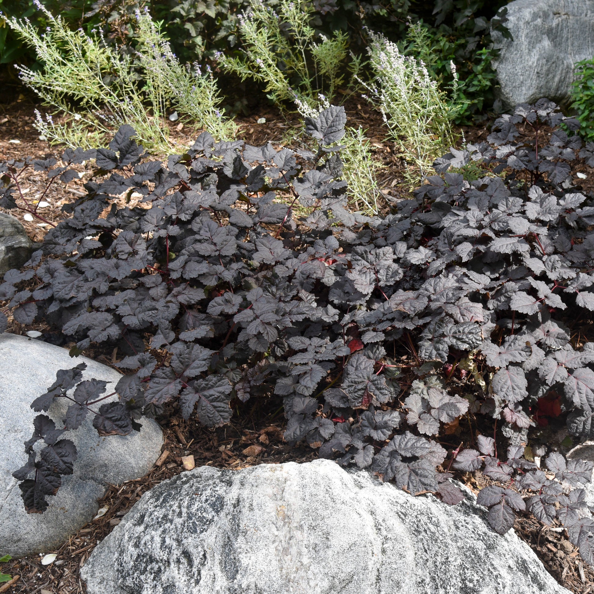 An instant classic for the landscape! 'Dark Side of the Moon' is the only dark leafed Astilbe with purple flowers that's on the market. Rich deep chocolate burgundy leaves form an incredibly attractive mound of foliage. Emerging leaves are yellow with a dark margin with a glossy sheen that become completely dark as they age. Dark stems hold raspberry buds that burst forth with rosy purple flowers. This performs best both for growing and flowering in full sun in the north with adequate moisture, but also grows in shade.